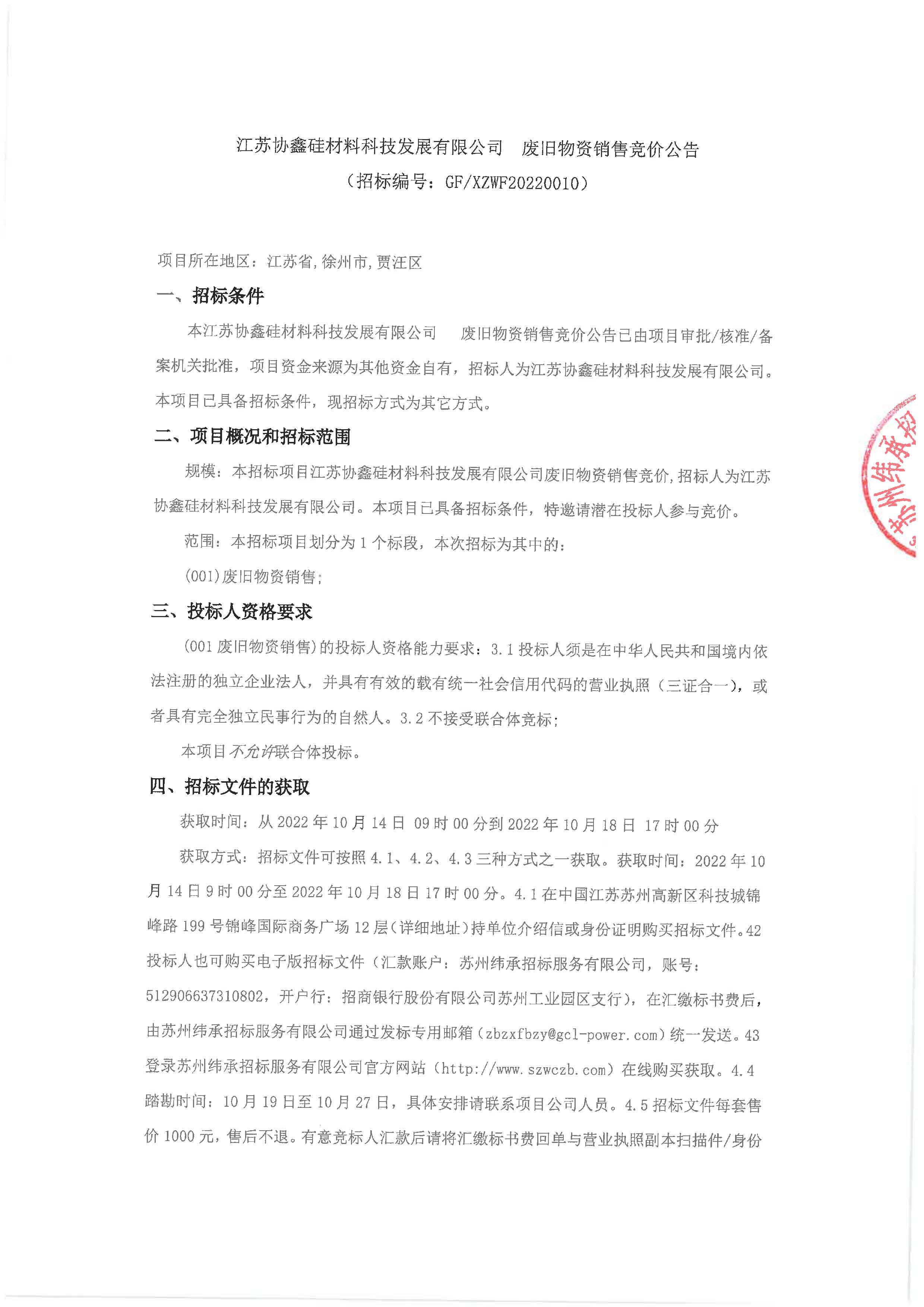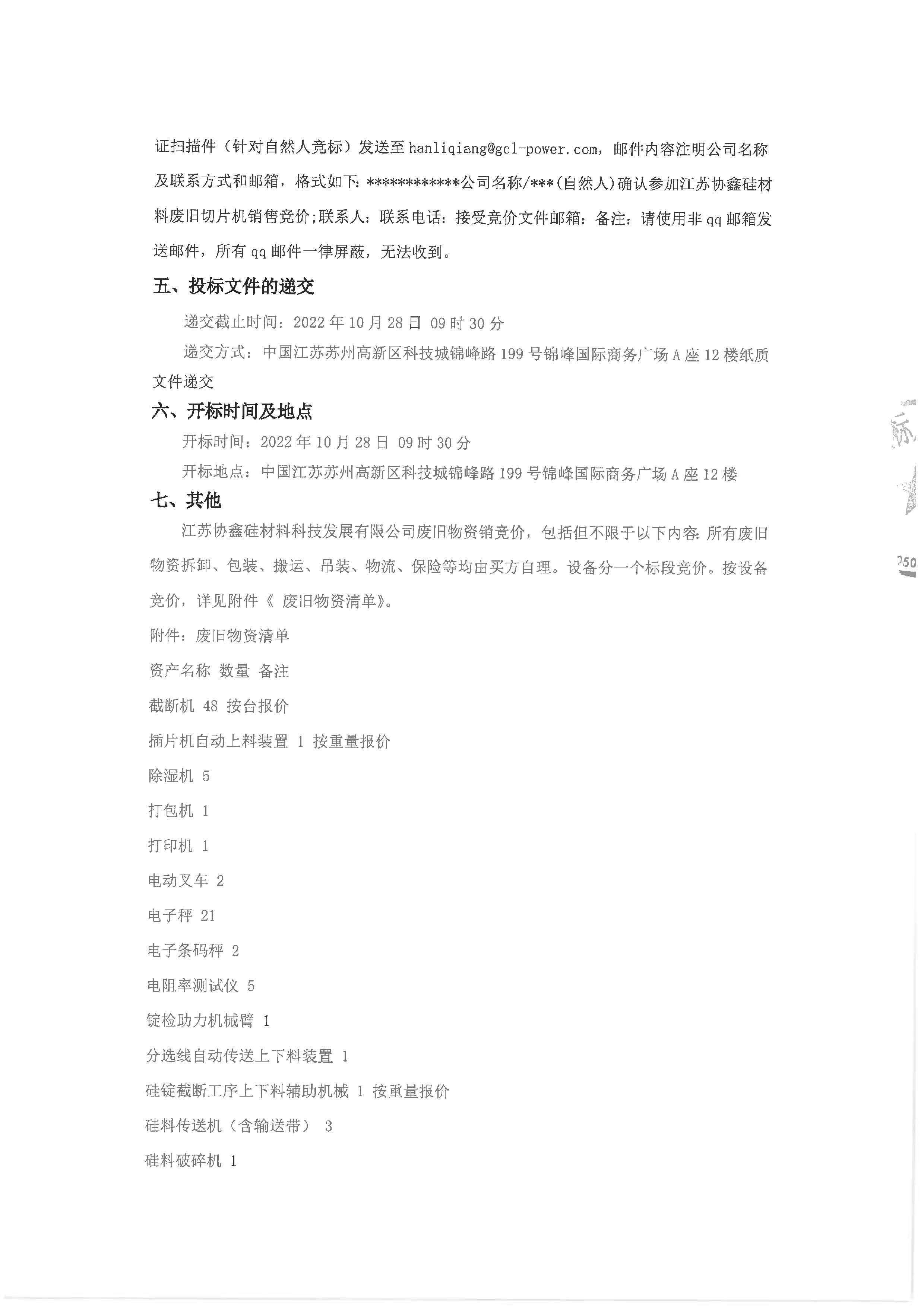 江苏协鑫硅材料科技发展有限公司废旧物资销售竞价招标公告