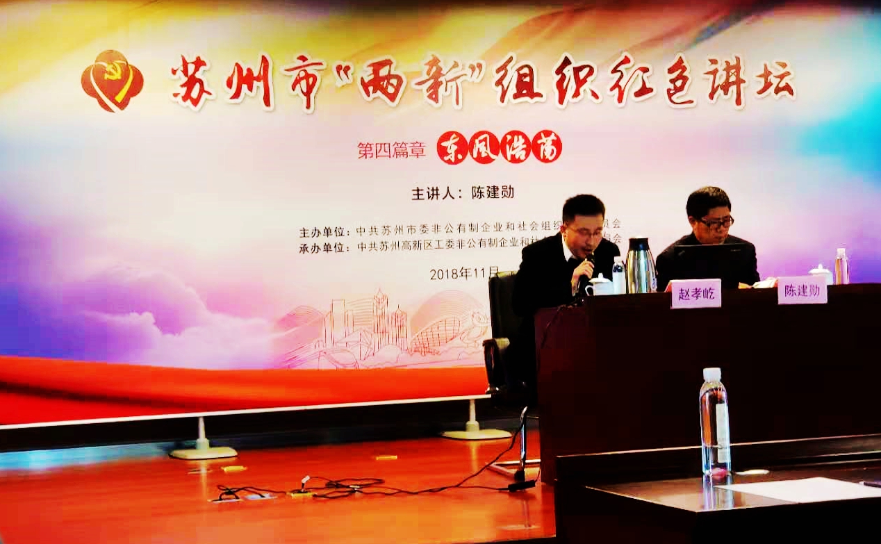 为提高苏州市“两新”组织对当前政治经济形势和政策的认识,凝心聚力推进“两聚一高”新实践,由苏州高新区工委“两新”工委承办2018年度全市“两新”组织“红色讲坛”,邀请全国知名专家者分别围绕“复兴之路”“激荡风云”“长青之道”“东风浩荡”等四个主题做专题报告。